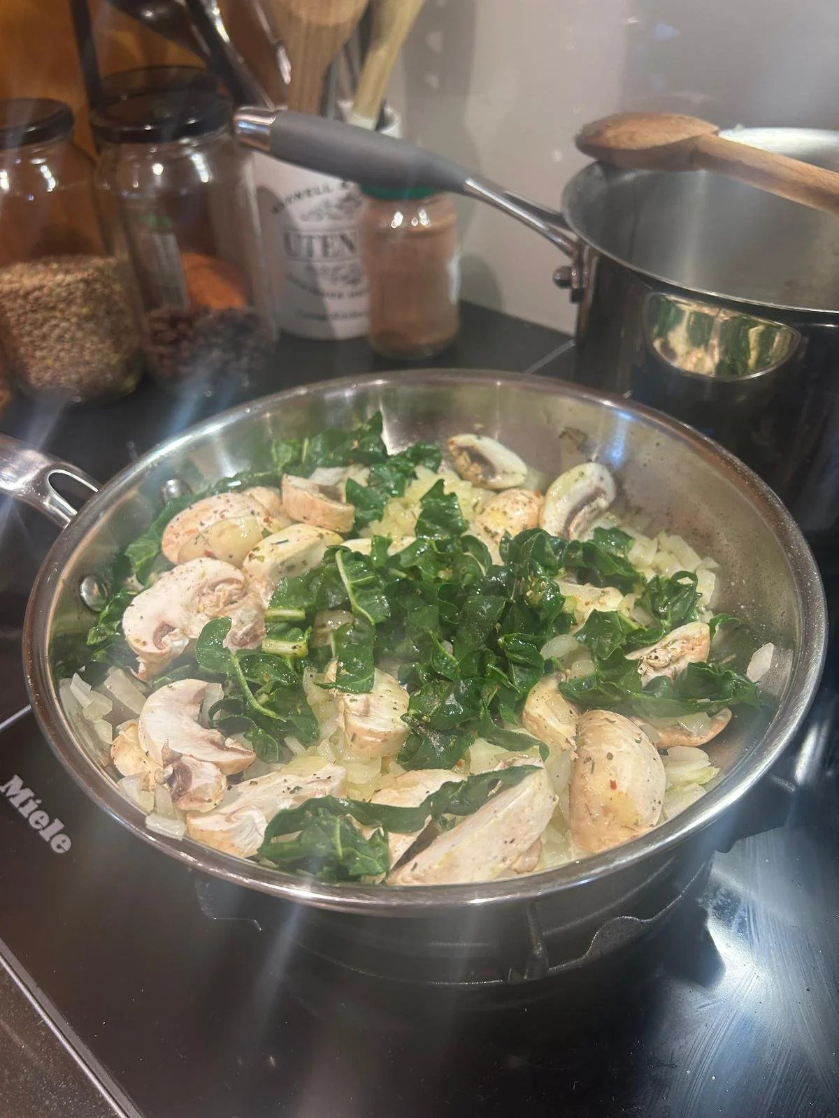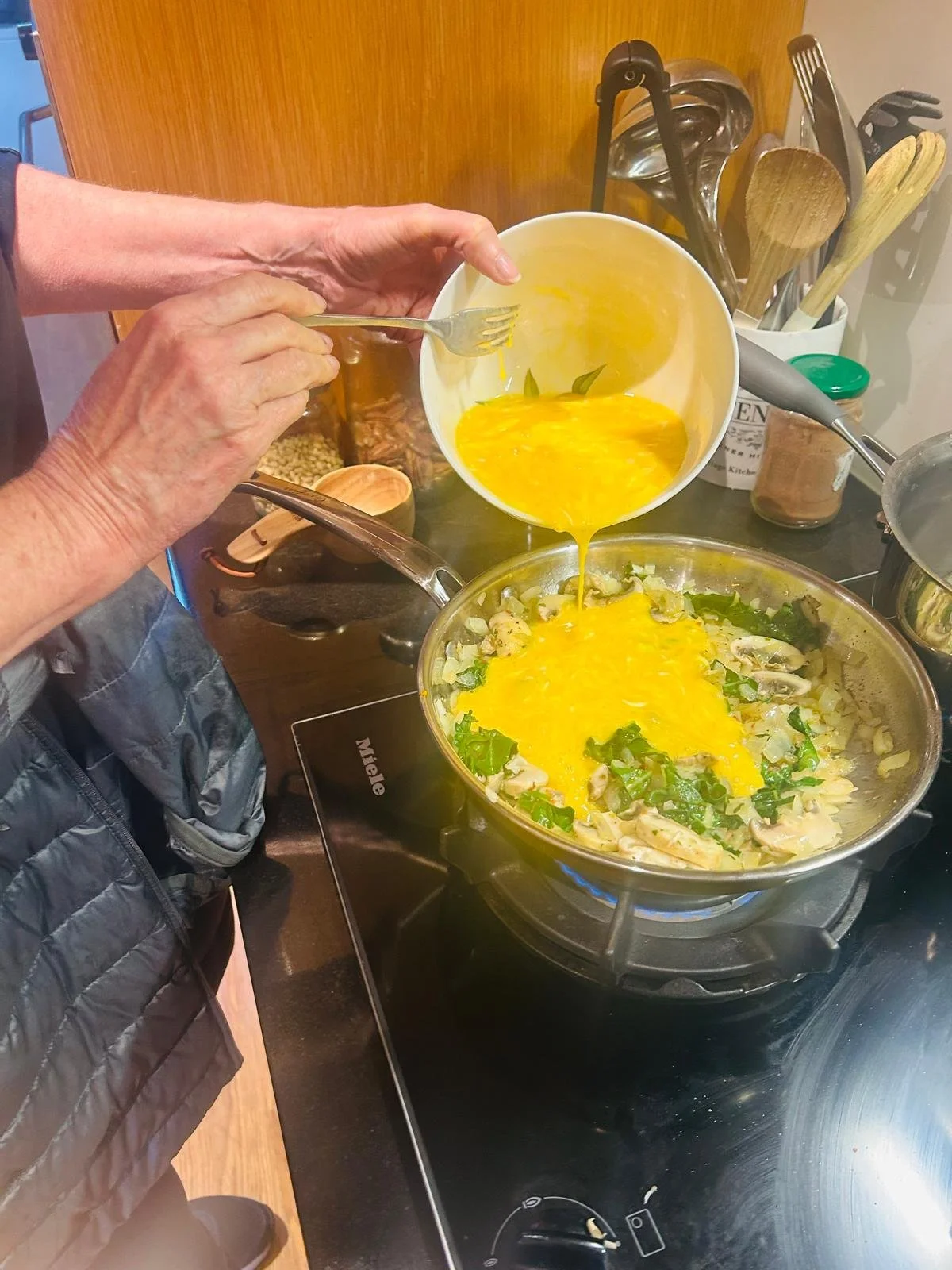Add in your yoghurt with your egg mix in a seperate bowl. Add herbs now.
